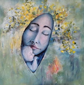 2023Op mijn reis door het zuiden van Europa werd ik getroffen door de devotie van veel mensen voor Maria. Ze wordt gezien als de moeder van alle moeders, als bemiddelaar tussen God en mensen, en dat heeft mensen al eeuwen aangezet tot het maken van reusachtige kerken, kunstige beeldhouwerken, en betoverende schilderijen. In dit werk heb ik de tederheid en zachtheid van Maria met haar kindje proberen te treffen.